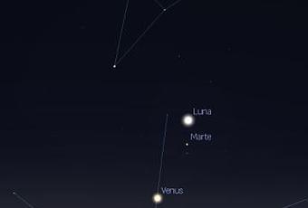 Los días 17 y 18 de octubre sí madrugáis un poco podréis ver a tres astros “bailando en el espacio”, los bailarines interplanetarios son Venus, Marte y la Luna en fase menguante. Y los veréis muy juntos en el cielo esos dos días.