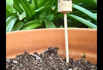 En estas ocasiones es cuando hecho de menos no haber puesto unos marcadores. Una vez hice unos con trozos del plástico del yogurt y rotulador que se supone indeleble, pero el plástico se estropea. He encontrado estos marcadores para plantas realizados con corchos y me han parecido muy sencillos y duraderos, además en estas fiestas seguro que nos sobran corchos.