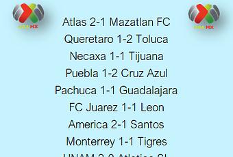 Atlas 2-1 Mazatlan FCQueretaro 1-2 TolucaNecaxa 1-1 TijuanaPuebla 1-2 Cruz AzulPachuca 1-1 GuadalajaraFC Juarez 1-1 LeonAmerica 2-1 SantosMonterrey 1-1 TigresUNAM 2-0 Atletico SLhttps://instagram.com/vivoelfutbol/https://youtube.com/@VivoelfutbolGracias por tu visita