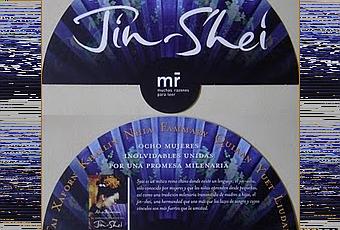 Estos son unos marcapáginas de tamaño maxi, que están muy bien pensados para cuando paseas por una Feria del Libro y estás achicharrado de calor, pero que a la hora de utilizar normalmente son poco prácticos porque son enormes, salvo que los utilices mientras lees una enciclopedia.El de "El lenguaje secreto del Jin-Shei" me lo dieron cuando compré la novela, que por cierto me encantó. Es la historia de ocho mujeres cuyas vidas se entrecruzan en el reino chino de Syai. Todas acabarán unidas por el Jin-Shei, una costumbre milenaria que pasa de madres a hijas y con un lenguaje propio, el jin-ashu, que sólo conocen las mujeres y que les permite expresarse con total libertad y sin miedo a que ningún hombre las entienda.