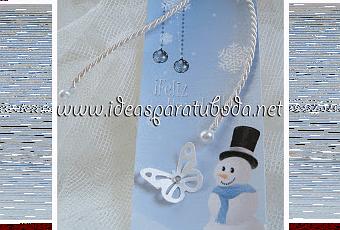 Os presento el mío........Ya sabéis que me encanta el diseño y crear, como teníamos que centrarnos en el tema de la Navidad decidí mezclar copos de nieve, con bolas navideñas y un muñeco de nieve......Para darle un toque especial coloqué cerca del muñeco una mariposa y la decoré con un brillantito. Luego perforé la parte superior y le coloqué un cordoncito en tono crudo y rematé las puntas con dos perlas.