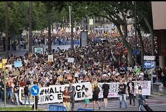 Mallorca no se vende. Manifestación contra la masificación turística. Como ya sucedió hace unas semanas con Canarias, entre 10.000 y15.000 personas se manifestaron el sábado, 25 de mayo por las calles de Palma para protestar contra la masificación turística en Mallorca, reivindicado el acceso a una vivienda “digna”. La marcha, convocada por la entidad Banc del Temps de Sencelles, tuvo por lema “Mallorca no se vende-Digamos basta” y la participación de ciudadanos sorprendió a los propios organizadores. “La protesta estuvo encabezada por dos grandes pancartas, en una de las cuales figuraba el referido lema y en la otra se afirmaba: ‘Si nos niegan nuestro techo, nos niegan nuestro futuro: derecho a una vivienda digna’. Algunos de los asistentes llevaban carteles, en los que se preguntaba qué trae el ‘turismo de masas’ y se respondía: ‘masificación, atascos, contaminación, insostenibilidad’. En otra pancarta se podía leer: ‘Too many tourist, too many cars, too many yachts...SOS residents’ (demasiados turistas, coches y yates). ‘Quien ama Mallorca no la destruye’, fue una de las muchas proclamas coreadas”. Otras consignas esgrimidas: “Amamos Mallorca y queremos vivir aquí” y “La vivienda debe ser un derecho y no un negocio”. La manifestación partió del Parque de las Estaciones de Palma y concluyó con la lectura de un manifiesto en el Paseo del Borne”. Algunos de los asistentes portaban carteles, como uno donde se preguntaba qué trae el “turismo de masas” y se respondía: “masificación, atascos, contaminación, insostenibilidad”. Los manifestantes protestaron contra la masificación turística que vive Baleares y reclamaron el acceso a una “vivienda digna”, proponiendo como requisito haber residido cinco años para comprar una casa. “Esta tierra debe ser un lugar donde nuestros hijos e hijas puedan crecer con seguridad y dignidad, con un turismo controlado que no condicione toda nuestra vida”, afirmaron en el manifiesto redactado por El Banc de Temps de Sencelles, una organización vecinal nacida en 2010 en el pequeño municipio mallorquín, que cuenta con 3.795 habitantes, según el padrón de 2023. El manifiesto recoge siete medidas para detener la actual situación de masificación turística y el derecho a poder comprar o alquilar una casa a un precio asequible para los residentes, tras su continua subida por el gran interés de ciudadanos extranjeros por invertir en el archipiélago o disponer de una segunda residencia. Otros objetivos fueron aprobar una moratoria de alquiler turístico y ofrecer garantías a inquilinos y arrendatarios, así como ayudas para la rehabilitación de viviendas y el “realojamiento” de las personas desahuciadas a causa de la imposibilidad de pagar el alquiler, tal y como prevé la actual legislación. “Estas demandas son esenciales para asegurar que las Islas Baleares sigan siendo un lugar vivo, diverso y acogedor; debemos luchar por nuestros hogares, por nuestras familias y por nuestra dignidad”, se dice en el manifiesto leído al final de la protesta en el Paseo del Borne de Palma.