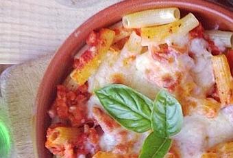 200 gr de macarrones100 gr de carne de ternera picada1 cebolla tierna4 tomates maduros grandesAceiteSalOréganoQueso rayado para gratinarRallamos la cebolleta y rehogamos en una sartén con un chorrito de aceite. Cuando esté bien pochadita añadimos la carne picada y sofreimos unos minutos. A continuación, añadimos el tomate pelado y triturado, sal al gusto y una cucharadita de orégano. Dejamos a fuego lento, tapado y removiendo de vez en cuando, durante unos 15-20 minutos. Mientras se hace el tomate hervimos la pasta en un cazo con agua, sal, una cucharadita de aceite y una hoja de laurel. Cuando esté cocida, la enfriamos bajo el grifo y la escurrimos bien, para evitar que siga cociéndose.Cuando la salsa esté lista, añadimos la pasta, le damos un par de meneos para que se empapen bien todos los macarrones, los colocamos en una fuente de horno o cazuelitas individuales, añadimos el queso, un poco de orégano y gratinamos en el horno a 180 ºC.