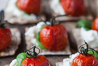 Tomates Cherry horneados, queso crema unido con crema agría y albahaca Los tomate se hornean con en la misma rama, con un poco de sal, azúcar y aceite, a 100º durante dos horas y media, incluso tres. Después se deja enfriar a temperatura ambiente.(esta receta es de una sueca y también emplean un jarabe dulce que para mi es totalmente nuevo, me imagino que puede estar bueno con un poco de miel o alguna mermelada suave). Si quieres ver la receta original, pinchad aquí