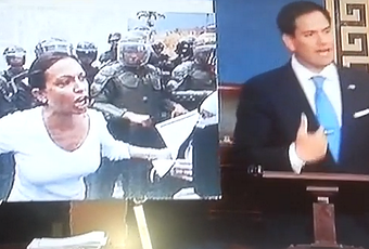 La primera fotografía que mostró el senador por Florida fue la del dirigente opositor Leopoldo López cuando era apresado por la GNB en Caracas. Denunció que fue detenido solo por protestar contra el Gobierno de Maduro y calificó a los funcionarios venezolanos como unas “marionetas” de La Habana. Añadió que agentes militares cubanos están infiltrados en este país a cambio del petróleo barato y gratis que se le provee.