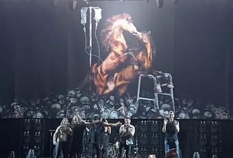 El concierto de Marea estaba programado a las 22:00 y afortunadamente poco más hubo que esperar, porque la lluvia también se dejó ver en el Auditorio Miguel Ríos con la misma puntualidad. De manera que baño de masas y baño sin más durante la primera parte del concierto. "Que nadie los puede parar, los potros del tiempo pasan, que nadie los puede parar...", sonaban estos versos flamencos mientras Kutxi Romero (voz), 'Piñas' (bajo), 'Kolibrí' (guitarra), César Ramallo (guitarra) y Alén Ayerdi (batería) ocupaban posiciones sobre el escenario. Por cierto, escenario descomunal, con una pantalla gigante a cada lado para no perder detalle —desde la grada se agradece especialmente— y cierta calavera coronando la estructura. "Buenas noches, Madrid. No, Madrid no, que es de Ayuso. Esto es Rivas", saludó Kutxi en unos primeros compases que fueron los del listado de Los potros del tiempo, cuya portada presidía el escenario. Así pues, Otra cicatriz, Más me duele a mí y La grillera —con guiño a Rock You Like A Hurricane de Scorpions— fueron las tres primeras canciones.