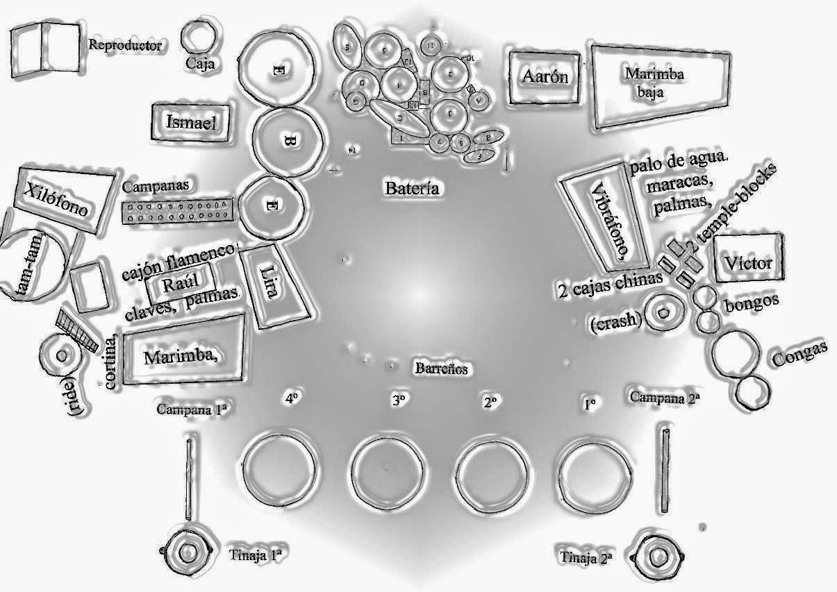 Llanto por el Mar nuestro, precisa de cuatro bloques metálicos tipo yunques, golpeados con mazas de cierto calibre, quizá lo más fácil y económico, sean cuatro trozos de viga de acero, que se pueden conseguir en cualquier casa de derribos de segunda mano, donde también te las pueden cortar a la medida deseada, aunque también las puedes pedir nuevas por encargo en una metalurgia, pudiendo encargar las que más convengan en sonoridad y comodidad.Para esta pieza he previsto dos opciones distintas, bien se puede interpretar con cada instrumentista en su set, o también con un montaje similar al de la introducción, situándose los cuatro instrumentistas en el mismo espacio que ocuparon los barreños, y quizás también se puedan aprovechar los mismos soportes de los barreños, iluminando paulatinamente la entrada de cada instrumento, ya que las entradas también son fugadas, hecho que enlaza con la introducción, dotando de simetría al conjunto del espectáculo.En este caso el problema consistiría en decidir el momento de montaje de los yunques en el centro del escenario, ya que quizás no interese que se encuentren ahí desde el principio de la actuación, por ello he previsto dos electroenlaces con una duración de dos minutos y medio, para poder realizar el montaje y el desmontaje de los sets. Sería de gran efecto poder apagar las luces del escenario, dando relevancia al audiovisual, y que en el momento adecuado se fueran iluminando cada uno de los yunques.Estos enlaces electrónicos hacen la función de puente ya que nos acercamos al momento central del espectáculo donde cambiamos de estilo y sentimiento, así el primero de ellos reúne elementos de la primera parte, y el segundo electroenlace desarrolla el tema propuesto en el llanto por el mar nuestro, tema que yo mismo grabé con una cantante turca y que tengo registrado en la SGAE, como arreglo de una música popular turca llamada Kirmizi Gul. Los cuatro primeros golpes del yunque del audio pueden ser usados a modo de claqueta para la primera entrada, a partir de la cual cada músico seguirá al anterior. He indicado en la partitura los golpes de yunque que deben sonar a tempo con el audio.