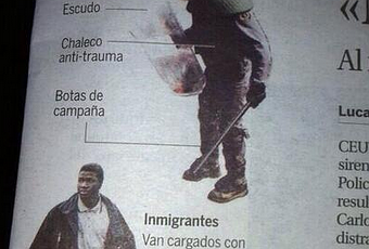 Se trata de dos siluetas: una representa a la Guardia Civil y otra a los inmigrantes. Ambas van acompañadas por información escrita. Lo primero que llama la atención es que la imagen del guardia civil se acompaña con unos textos escuetos que enumeran los distintos elementos de la indumentaria: “casco antidisturbios”, “escudo”, “chaleco anti-trauma” y “botas”. Si fuera muy quisquilloso me detendría en la omisión de la porra que porta el agente. Por el contrario, los textos que acompañan a la silueta del inmigrante son bien diferentes. La simple relación nominativa de elementos deja paso a la interpretación, suposición e intención. Ahora no se resalta lo evidente, ni se enumera fríamente los elementos del equipaje. En este caso, se detallan elementos que no están a la vista, que no son evidentes y se interpretan: “Van cargados con piedras, palos y botellas“, “Utilizan una manta para cubrir las concertinas“. Pero es en el tercer apartado descriptivo donde la falta de rigor, la negligencia y el fanatismo xenófobo se muestran crudos y desagradables.