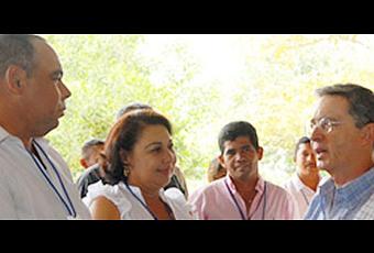 El Presidente Álvaro Uribe saluda al ex candidato a la Alcaldía de Tierralta, Córdoba, Fabio Otero Paternina, y su esposa, Ana Cecilia Avilez, secuestrados por las Farc y quienes recobraron la libertad gracias a operaciones conjuntas del Ejército y la Policía.