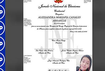El Jurado Nacional de Elecciones (JNE) mediante Resolución 344-2020, el Jurado Nacional de Elecciones convocó a la ciudadana Alexsandra Mariapía Canales Arrascue para que ocupe el cargo de consejera por la provincia de Huaura en el Consejo Regional de Lima, en reemplazo del fallecido Víctor Terrones Mayta.