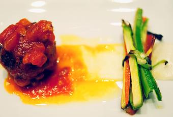 Presentada la carne en forma de albondiga y acompañada de una verduras de temporada, este plato lo regamos con un Cepas Viejas 2008 de Dominio de Tares, un vino que por su fruta negra y notas minerales creemos que es una combinación perfecta para tan redondo condumio; y donde los recuerdos de violeta y balsámicos maridan casi de forma empírea con las verduras que acompañan.