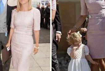Y una curiosa coincidencia, ambas princesas llevaban el mismo vestido de escote barco, tela rosa brocada y cinturón con rosetores de pedrería, de Dolce & Gabbana. Ambas lo combinaron con zapatos de salón a tono. Victoria llevaba un tocado de raso con flor y Marie Chantal lucía pamela.