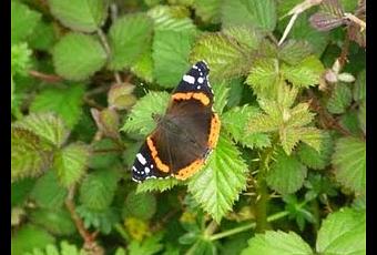 Una de las más hermosas y frecuentes es la vanesa o vulcana, en inglés conocida como "almirante rojo", la Vanessa atalanta, que se puede ver en casi cualquier parte.