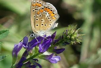 Buena parte de estas mariposas pequeñas pertenecen a la familia de los licénidos. Y entre ellas la más frecuente en la campiña es sin duda la llama ícaro o dos puntos Polyommatus icarus. Esta especie tiene un marcado dimorfismo sexual tanto en el anverso como en el reverso, siendo la hembra por la parte inferior más oscura, con las manchas anaranjadas más llamativas.