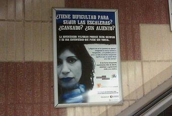 Un médico amigo y asiduo del blog me envía una fotografía de propaganda que ha encontrado en la parada de Metro de cerca de su casa “Les Corts”, en Barcelona, justo situada en la escaleras de manera que aquellas personas que se sofoquen al subir las escaleras, probablemente una de cada tres, me dice, se encuentren con el “mensaje” y empiecen a moverse con el temor de padecer una hipertensión pulmonar, probablemente entre uno y dos de cada 1.000.000. Según el galeno: “Colabora Bayer, Asociación Nacional de Hipertensión Pulmonar y no sé qué hace aquí una ONG europea de enfermedades raras“.