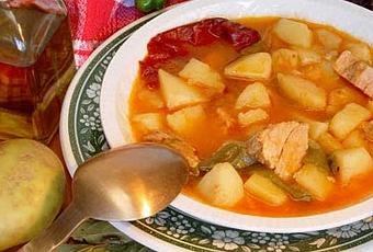 Se rehogan con aceite la cebolla, el pimiento, el ajo y el tomate, todos ellos picados. Se agregan las patatas en trozos, se mezclan con el resto de ingredientes y se añade agua caliente con una pastilla de caldo de pescado. Se deja hervir durante 20 minutos aproximadamente. Cuando las patatas estén hechas, se incorpora el bonito troceado, dejándolo cocer un par de minutos para que el guiso coja su sabor. NOTA: El pimiento seco se puede sustituir por una cucharilla de pimentón.