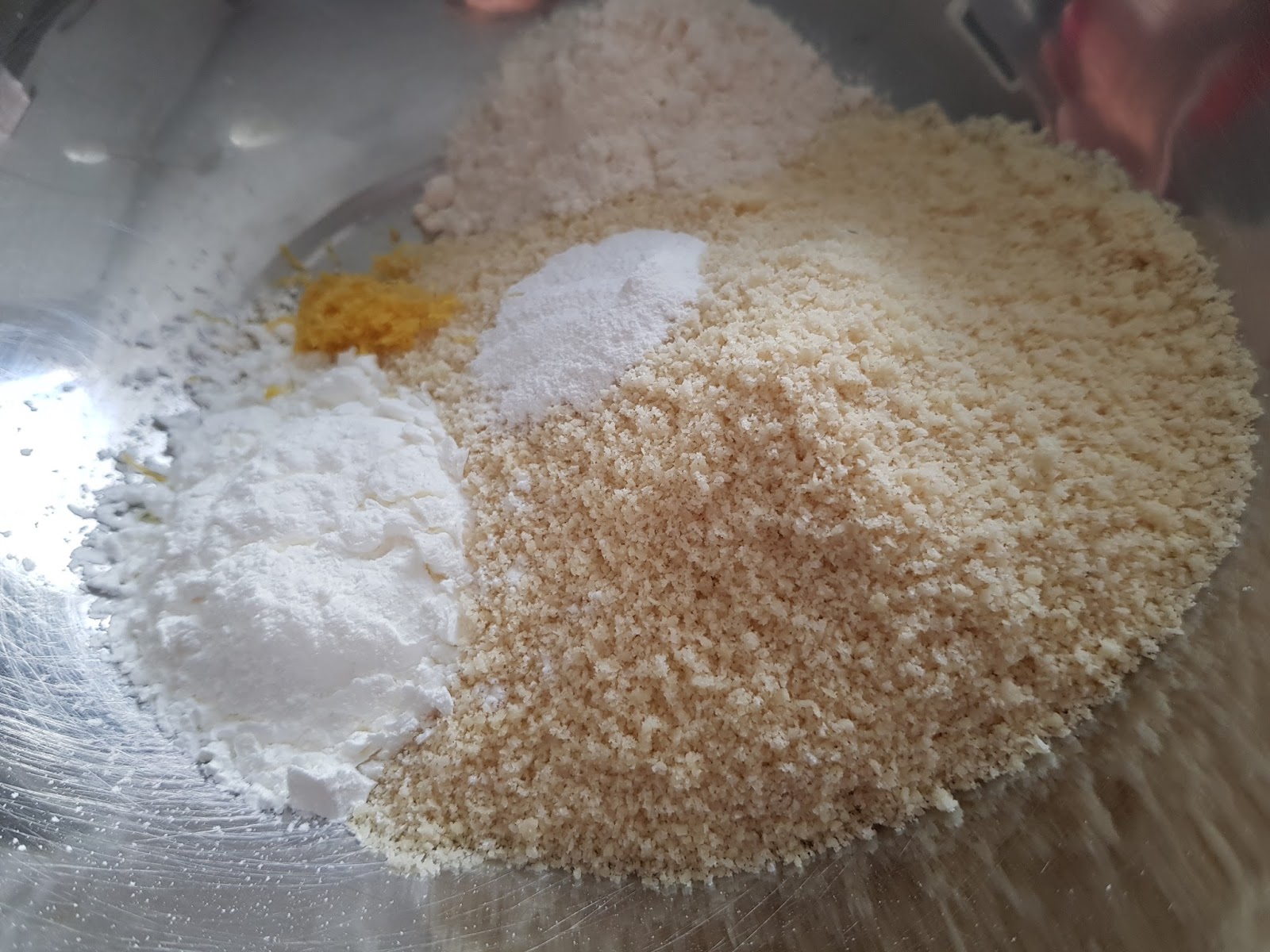 1. - Lo primero será encender el horno a 180º. Y en un bol ponemos las almendras, harina, levadura, ralladura de limón y el azúcar glas, excepto una cucharada que reservaremos para espolvorear después por encima y mezclamos bien.