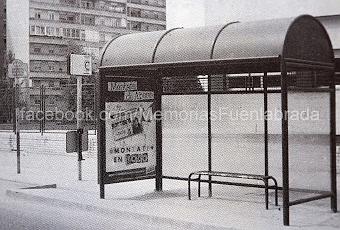 Imagen hacia 1988, de la marquesina de autobuses de la calle Galicia, 25 (barrio de El Naranjo). Se puede observar que estaba recién colocada, ya que aún se mantenía las antiguas placas de recorridos tanto la urbana como interurbana.