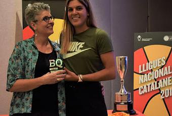 Montse Casademont y Marta Xargay con el premio de la Federació Catalana de Basquetbol por el oro en el pasado Eurobasket. Foto: Toni Delgado / Cronómetro de Récords.