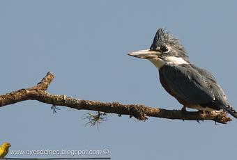 El 10 de Mayo cuando caminábamos por la Avenida Urquiza con Javier vimos desde el puente a este Martín pescador perchando en el árbol seco del costado del arroyo, como se quedó en el mismo lugar un buen rato aprovechamos para acercarnos un poco para tratar de fotografiarlo mas de cerca; acortar distancias sin tener algún lugar como para ocultarnos nos tuvimos que conformar con llegar hasta unos 20 metros mas o menos, las fotos no tienen la calidad de detalles de las últimas que mostré de esta especie pero no desaproveché esta nueva oportunidad para fotografiar al "Matraca".