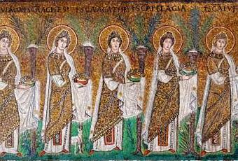 (En la imagen, mosaico paleocristiano de San Apolinar de Rávena, representando a las vírgenes mártires portando las coronas del triunfo. De izquierda a derecha: Eulalia, Inés, Águeda, Pelagia y Eufemia).