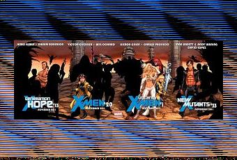 Del bando dorado aún no se ha publicado una imagen oficial, pero si hacemos recuento por los teasers y los juntamos mentalmente de forma chapucera, tenemos a Lobezno, Rondador Nocturno (el de la Era de Apocalipsis), Pícara y Kaos.