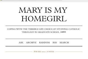 Mary Is My Homegirl es un blog anónimo de una chica del Departamento de Teología de Notre Dame. No mucho más se sabe, aunque hay claras sospechas de quién es la dueña (sorry!). Sea como fuere, el blog es EXCELENTE y si bien tiene bromas muy propias de nuestro Departamento, lo cierto es que es muy gracioso en general. Se los recomiendo ampliamente!