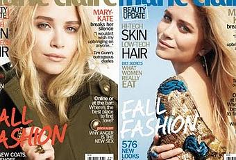 Arriba, Mary-Kate en dos portadas diferentes, a la izquierda lleva chaqueta estilo militar de Burberry y a la derecha un vestido de lentejuelas de Emilio Pucci