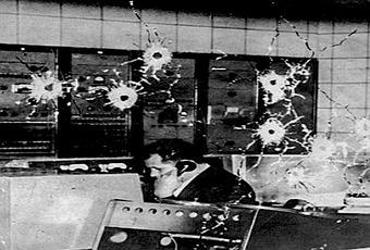 ¡Pueblo de Cuba!, son las primeras palabras de José Antonio Echeverría, 20 minutos después de las tres de la tarde del 13 de marzo de 1957, por la emisora Radio Reloj, al hacer la alocución del Directorio Revolucionario. En la foto, impactos de balas en la cabina de control de la emisora producto del asalto. Foto: Archivo de Granma