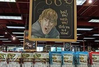 Skie, siempre a la que salta (Muchas gracias por ello, de verdad de la buena) y a raíz de lo que puse en esta entrada, me ha mandado dos fotos de carteles promocionales de patatas en supermercados, usando la famosa conversación entre Sam y Gollum sobre las patatas. No se si han hecho algo así por el estilo en España, en alguna tienda o supermercado, pero la verdad es que no deja de ser un detalle muy gracioso.