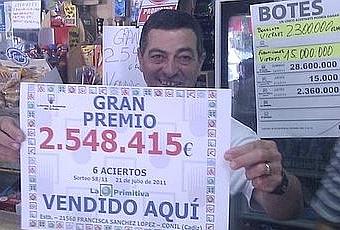 El boleto de La Primitiva sellado en el despacho receptor número 21.560 de Conil el pasado jueves fue agraciado con un premio de 2.548.415,12 euros. Además, en el mismo sorteo se registraron otros seis acertantes de segunda categoría, que recibirán 65.343,98 euros. La combinación que dio la suerte en Conil estuvo formada por los números 5, 21, 30, 33, 39 y 47. El número complementario fue el 40, y el reintegro, el 9.