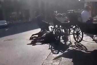 Un caballo se deslpoma en Palma mientras trsnsporta turistas, tras aguantar temperaturas de 40°. El dueño se mofa y los turistas se niegan a bajarse. “¿Te imaginas trabajar al sol durante horas, transportando a turistas por las calles de Palma de Mallorca? ¿Y no poder comer o beber agua cuando quieras? ¿Ser mayor, que te fallen las piernas y, aún, así tener que seguir trabajando hasta que no puedas más?”. Así empieza la última petición de firmas a través de la plataforma Change.org para prohibir las galeras en Palma.