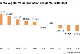 4.- CRECIMIENTO VEGETATIVO: El crecimiento vegetativo de la población residente (tiene en cuenta nacimientos y defunciones) presentó un saldo negativo, en 153.167 personas. Destáquese que ya venía siendo negativo desde 2017, aunque la caída de 2020 es particularmente importante.