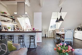 Si ayer compartíamos un apartamento con DECO nórdica con un toque clásico, hoy repetimos color de base (blanco) y pinceladas en toques lilas, pero en un espacio con carácter más desenfadado. Los áticos, que antiguamente se usaban para guardar o almacenar cosas, están ahora mismo de máxima actualidad, al igual que los lofts, son espacios muy interesantes a nivel decorativo.Las cubiertas inclinadas, que a priori pueden parecer un problema, se pueden aprovechar para almacenamiento y permiten además tener muchas ventanas y que la luz invada cualquier rincón, como en el caso del ático de hoy. Situado en un edificio de 1938, este ático de 85 m2 es elegante y funcional, lleno de luz natural que entra a través de las ventanas, paredes blancas que contrastan con los suelos de madera oscura, mobiliario sencillo y funcional, combinación de blanco, negro y gris, con detalles en tono pastel. Perfecto, no os parece?