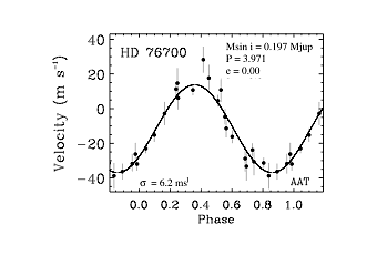 Ejemplo del estudio de un planeta alrededor de una estrella según el método de velocidad radial, usando datos del proyecto Anglo-Australian Planet Search (AAPS). En concreto, se trata del planeta HD 76700b, que tiene una masa de 0.23 veces la masa de Júpiter (el número en la figura es la medición antigua) y que da una vuelta alrededor de la estrella HD 76700 en 3.97 días, a una distancia media de 0.051 UA. Crédito de la imagen: Tinney, Butler y el equipo AAPS.