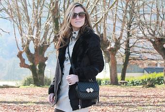 En esta ocasión aposté por el resto de prendas en color negro como son la chaqueta de ante y pelito, medias negras con botas moteras de charol y bolso también en negro.