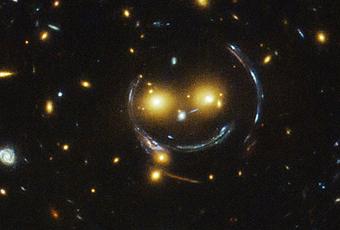 Dos ojillos naranjas que corresponden a las galaxias SDSSCGB 8.842,3 y SDSSCGB 8.842,4 (del cúmulo de galaxias llamado SDSS J1038 + 4849, que dista alrededor de 4,5 millones de años luz de la Tierra en la constelación de la Osa Mayor); una nariz blanca, que no sé exactamente a que cuerpo celeste corresponde, y una amplia línea curva como sonrisa, que es en realidad un arco causado por un efecto conocido como "lentes gravitacionales fuertes" conforman esta ilusión de "cara feliz" o "cara feliz ilusionada", que también lo parece.