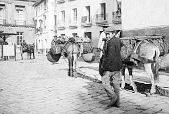 ¡Que estampa!, independientemente de la belleza del entorno, fijémonos en los detalles, desde esos hermosos adoquines, hoy arrancados y vendidos en gran parte a los Países Bajos, como también el de ese niño que acompaña al padre vigilando la burros que van con las alforjas llenas de patatas y legumbres que van a vender casa por casa. Otro hermoso y curioso detalle lo tenemos en la parte media-izquierda de la imagen...