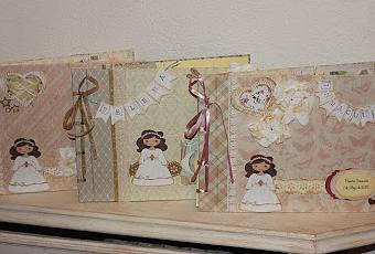 Para Córdoba salió un paquete bien grande con unos cuantos regalos de comunión: Tres álbumes en formato encuadernación japonesa, tamaño 23 x 31, con 10 hojas tamaño folio y mucho desplegable, cuatro cajas libro forradas en tela y , en su interior, cuatro marcos de fotos. Todo ello iba destinado a un grupo de amigas, inseparables en estas edades.Ya están entregados a cada una de ellas, así que aquí os los muestro.A mi me encantó el resultado.