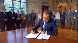 Artur Mas firmó su decreto para el anunciado referéndum con todo boato y bajo el control atento de los separatistas.El 27 de septiembre, el presidente catalán, Artur Mas, firmaba el decreto de convocatoria de la consulta soberanista del 9 de noviembre. Antes de la firma se leyeron los puntos que contiene, entre ellos las dos preguntas que se formularán a aquellos que participen del 9-N con la finalidad de que la Generalitat, con “conocimiento de causa, pueda ejercer las iniciativas legales, políticas e institucionales que le corresponda”. Para Artur Mas, este decreto se convoca “bajo el amparo de la ley de consultas, con respeto a los marcos legales”. Asegura que “Cataluña quiere hablar, quiere ser escuchada, quiere votar”. Sostiene que el proceso soberanista se basa en “amplias mayorías sociales, consenso político, búsqueda constante del diálogo y respeto a los marcos legales”. Insiste en reclamar al Gobierno central dirigido por Rajoy que haga lo posible por permitir la consulta, y garantiza que está abierto a pactar “hasta el último momento” las condiciones para hacer posible el 9 de noviembre, pero advierte que “no podemos caer en la trampa del inmovilismo vestido de una presunta legalidad”. Mas zanja su discurso con una intervención en castellano y en inglés para defender que su intención es que el proceso se haga desde el diálogo y la paz. Dice que se trata de una ley que regula las “consultas populares no referendarias”, que “pueden promoverse por iniciativa institucional o por iniciativa ciudadana”. La finalidad de las consultas convocadas bajo el amparo de esta ley es “conocer la opinión de la población sobre la cuestión sometida a consulta y su resultado no tiene carácter vinculante. Sin embargo, los poderes públicos que las han convocado deben pronunciarse sobre su incidencia en la actuación pública sometida a consulta, en el plazo de dos meses a partir de su celebración”. El Govern prevé que la consulta cueste unos 9 millones de euros, aunque la cifra acabará siendo superior porque no se incluye el IVA en algunas de las partidas; además, el decreto deja claro que todas las cifras presupuestadas son “una estimación y que, por tanto, pueden variar al alza o a la baja”. El TC deberá decidir cuándo convoca un pleno extraordinario para debatir el recurso, ya que no hay ningún pleno ordinario la próxima semana Una vez rubricado el decreto de convocatoria de la consulta, el Gobierno central ya ha puesto en marcha la maquinaria para frenar esta convocatoria. Se espera una reunión rápida y que el pleno admita el recurso, lo que paralizará de inmediato la convocatoria de consulta, con todos sus efectos, al menos durante un periodo de cinco meses.