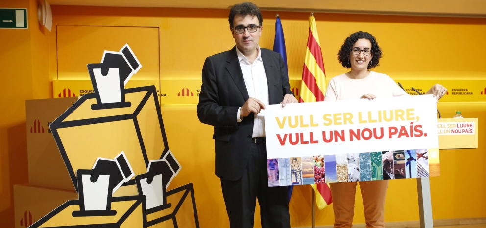 La secretaria general de ERC, Marta Rovira (d), junto al secretario general adjunto del partido, Lluís Salvadó. El mismo lunes, 29 de septiembre, tras la primeras palabras del TC, Artur Mas da un paso atrás y pasa el relevo a la ‘sociedad civil’ para que agite la calle. Y el Gobierno español teme la incontrolable presión de la calle, agitada por la Generalitat hasta la fecha mismo de la consulta. El Gobierno catalán cumplía los compromisos adquiridos con sus socios y las promesas del programa electoral. “Nadie nos podrá reprochar nunca que no cumplimos nuestra palabra”, confiesa a El Confidencial un alto dirigente convergente que prefiere guardar el anonimato. A partir de ahora, y para no caer en ilegalidades, es la “sociedad civil” quien toma la iniciativa, porque el proceso y la transición nacional no se paran. Cierto que el Gobierno catalán seguirá manteniendo la alerta “por si, en cualquier momento, se produce un fallo y se permite seguir con el proceso de la consulta, ya que consideramos que tanto la Leyde Consultas como el decreto de convocatoria son plenamente constitucionales y por ello levantará la suspensión”. Pero la punta de lanza del desafío se traslada a otros actores. Serán los partidos políticos que apoyan el referéndum (CiU, ERC, ICV y la CUP), juntamente con las organizaciones Asamblea Nacional Catalana (ANC) y Òmnium Cultural, quienes tomen el relevo para inundar las calles de la “marea amarilla”.Y los soberanistas anuncian para la tarde del martes concentraciones en las plazas mayores de los pueblos de Cataluña para protestar contra la suspensión del proceso por parte del Constitucional. La secretaria general de Esquerra y el secretario general adjunto, Marta Roviray Lluís Salvadó respectivamente, se adelantan a los acontecimientos, previendo la respuesta del TC, y presentan su campaña Vull ser lliure, vull un nou país (Quiero ser libre, quiero un nuevo país). “Es nuestra respuesta a las acciones de prohibición del Estado”, justifics Salvadó. “Ante la prohibición, apelaremos a la libertad. Ante la intolerancia, normalidad democrática. Ante el estado de excepción, campaña y debate de ideas”, añade. Marta Rovira, por su parte, anuncia que los republicanos no se quedarán con los brazos cruzados. “Ahora es cuando empieza verdaderamente la guerracontra España. Si hemos de escoger entre obedecer el mandato democrático de la ciudadanía de Cataluña o bien, obedecer una sentencia del Tribunal Constitucional o un proyecto sin contenido, que nadie tenga ninguna duda de que obedeceremos el mandato democrático de los catalanes y daremos una oportunidad a este mandato”. Lo dice un partido que obtuvo 496.000 votos, que evidentemente se han de sumar a los 1.112.000 de CiU, los 358.000 de ICV y los 126.000 de la CUP. Entotal, pues, 2.092.000 votos sobre 5.257.000 ciudadanos con derecho a voto.