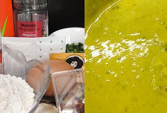 Poner en un recipiente la leche, los huevos, el ajo y perejil picado, la gaseosilla, la sal, pimienta