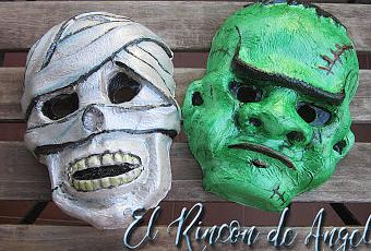 Para Frankenstein, cualquier chaldal viejo, te puede servir, solo tienes que hacerle algunos rotos y ya lo tienes. Junto con esta mascara, que es super fácil de pintar. No tienes que ser picaso, ni mucho menos. Con 4 toquecitos, la tienes. Para la momia, con unos leggins blancos y una camiseta blanca también, les pegas algunos trozos de vendas, que cuelguen, y junto con la máscara, también tenemos otro terrorifico disfraz.