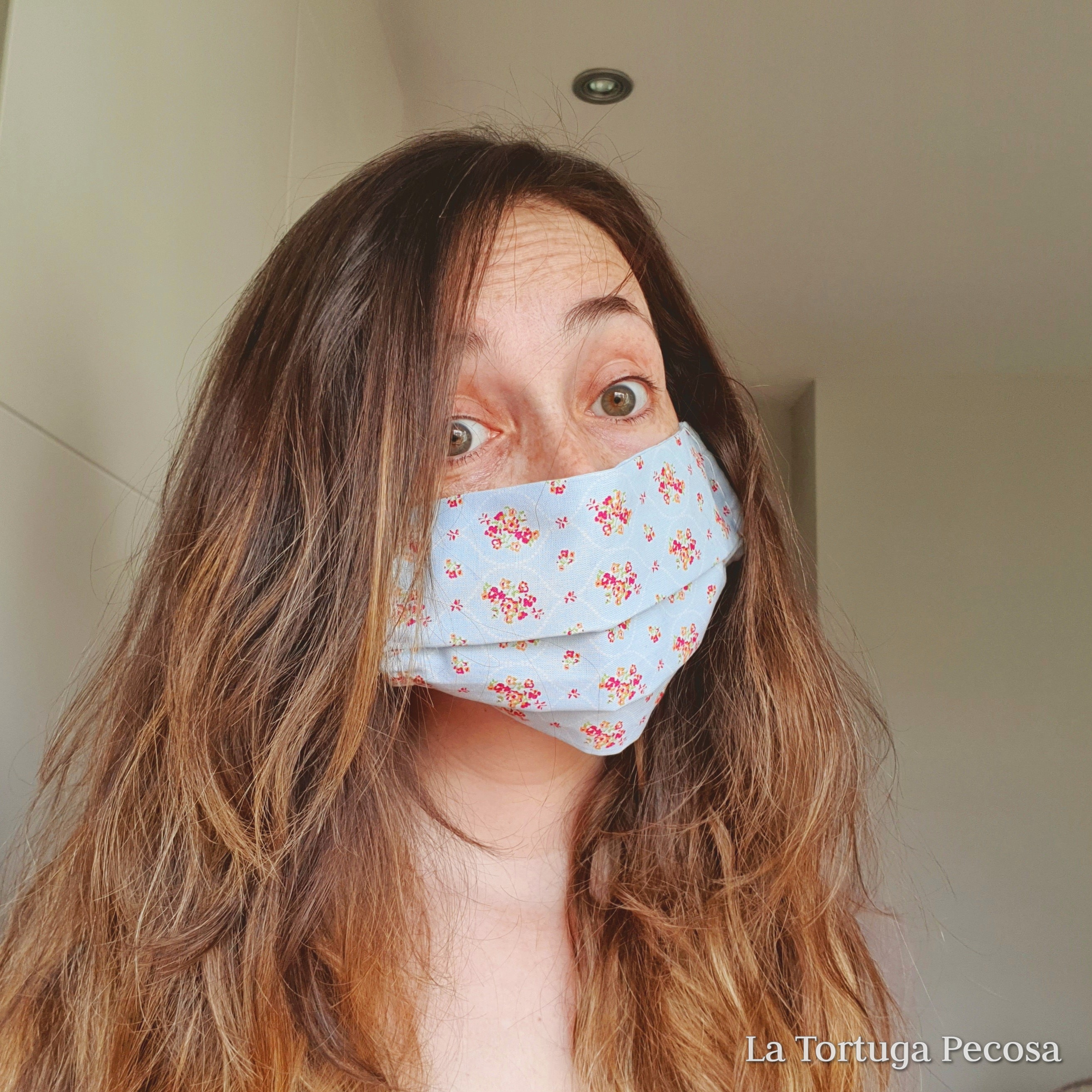 Buen día de sábado. Hoy os traigo esta mascarilla color azul clarito con flores, 100% algodón, tipo acordeón, con adaptador de nariz y con filtro tnt para luego cambiar.