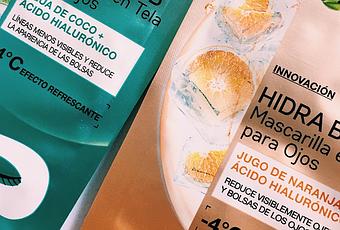 Empezamos por la mascarilla verde, Hidrabomb con agua de coco y ácido hialurónicoEsta mascarilla tiene una forma de anteojo, abarca la parte superior, costados e inferior del ojo. Es un producto hidratante con ingredientes antioxidantes que ayudan a refrescar un contorno cansado. Reduce las líneas de deshidratación.