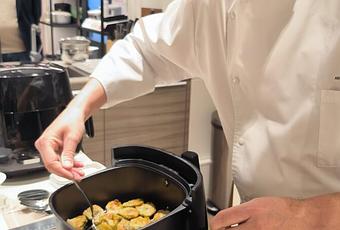 El chef Antonio Delgado nos ofreció una clase magistral de alcachofas confitadas con huevo poché y caramelo de café y unas tartas de queso y café, de chuparse los dedos. Como no podia ser de otra manera, con toda la tecnología de última de Zwilling.