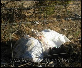 Son las siete de la tarde. Voy subiendo. Mi vista se detiene en unas bolsas grandes a la orilla del camino entre cruce Las Vertientes con San Juan de Pirque en la comuna de Santiago. Me detengo, me bajo. Lo primero es el olor nausabundo que existe en el lugar, las bolsas están llenas de moscas, apenas puedo mantener la respiración. Raro encontrar bolsas de sacos donde envasan el alimento de perros, un saco económico dentro de las marcas. Voy por una tijera, conteniendo la respiración me acerco, le hago un corte, se siente duro al tacto, quedando al descubierto bolsas tipo basura negras, vuelvo a cortar, el asombro es grande cuando veo que lo presentido se hace realidad.