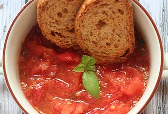 Para 2 personas:4 tomates maduros;2 dientes de ajo;1 manojo de albahaca fresca; Aceite de Oliva; SalPan Tostado