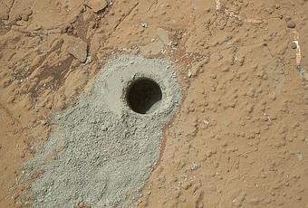 Imagen 1: Primera detección definitiva de materia orgánica en la superficie de Marte a través del polvo de roca en la zona apodada "Cumberland". Créditos: NASA/JPL-Caltech/MSSS.