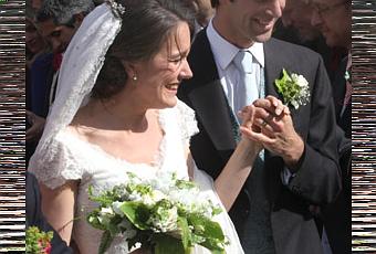 La novia eligió un vestido de encaje, manga corta, escote en uve y velo bordado y llegó a la iglesia del brazo de su hermano el Conde Charles-Henri d'Udekem d'Acoz.